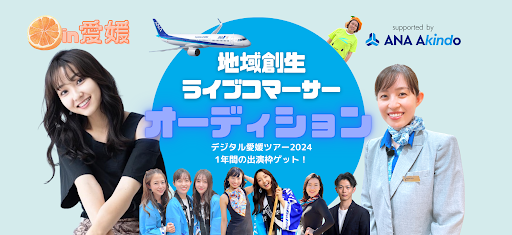 2023年、ANAあきんど松山支店と共同で実施した「地域創生ライブコマーサーオーディション」では、 公式アンバサダーを選出し、愛媛の魅力を全国へ発信しました。 現在、オーディションを通して選ばれた3名が専属ライブコマーサーとして地域を盛り上げています。
